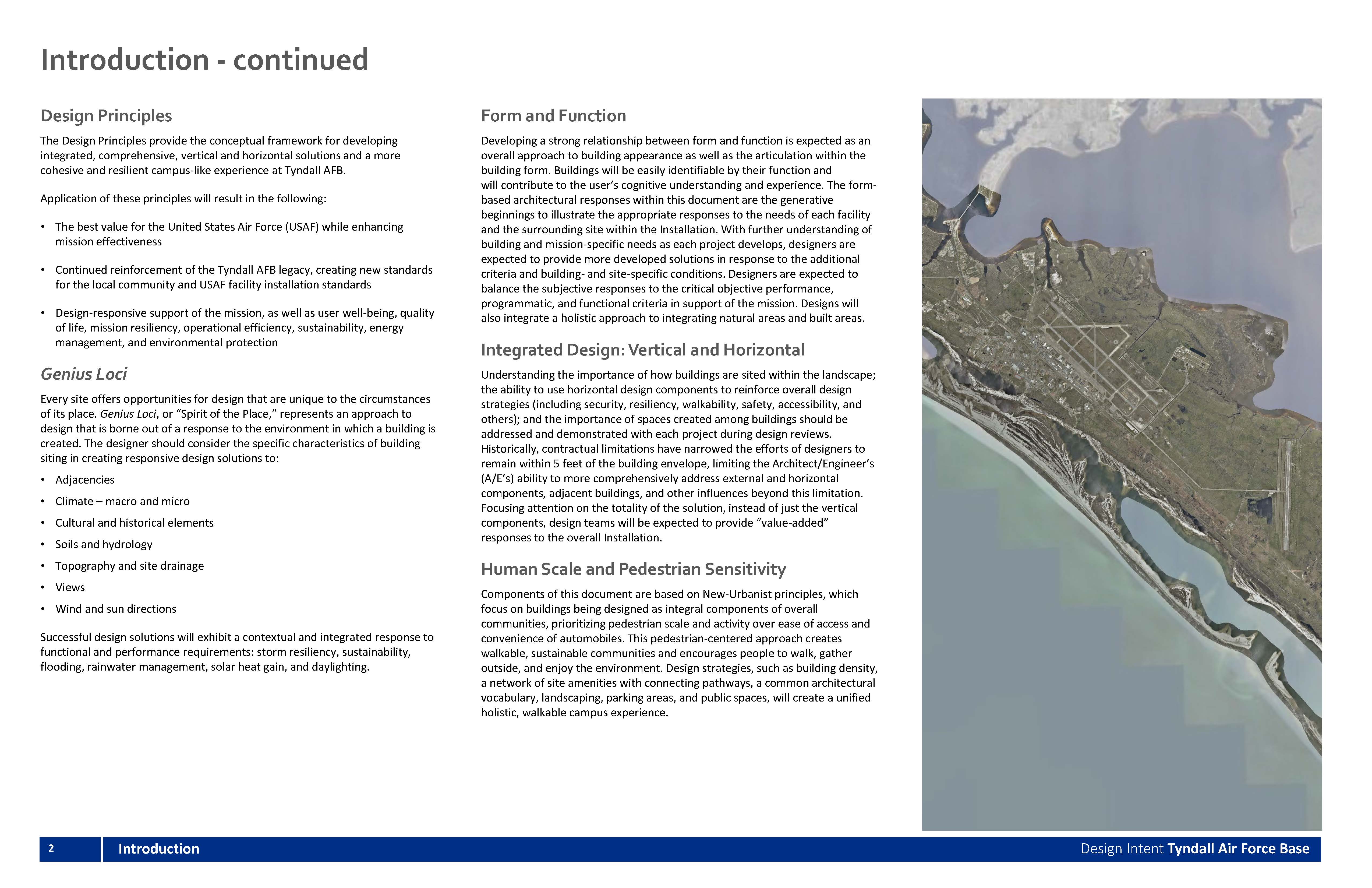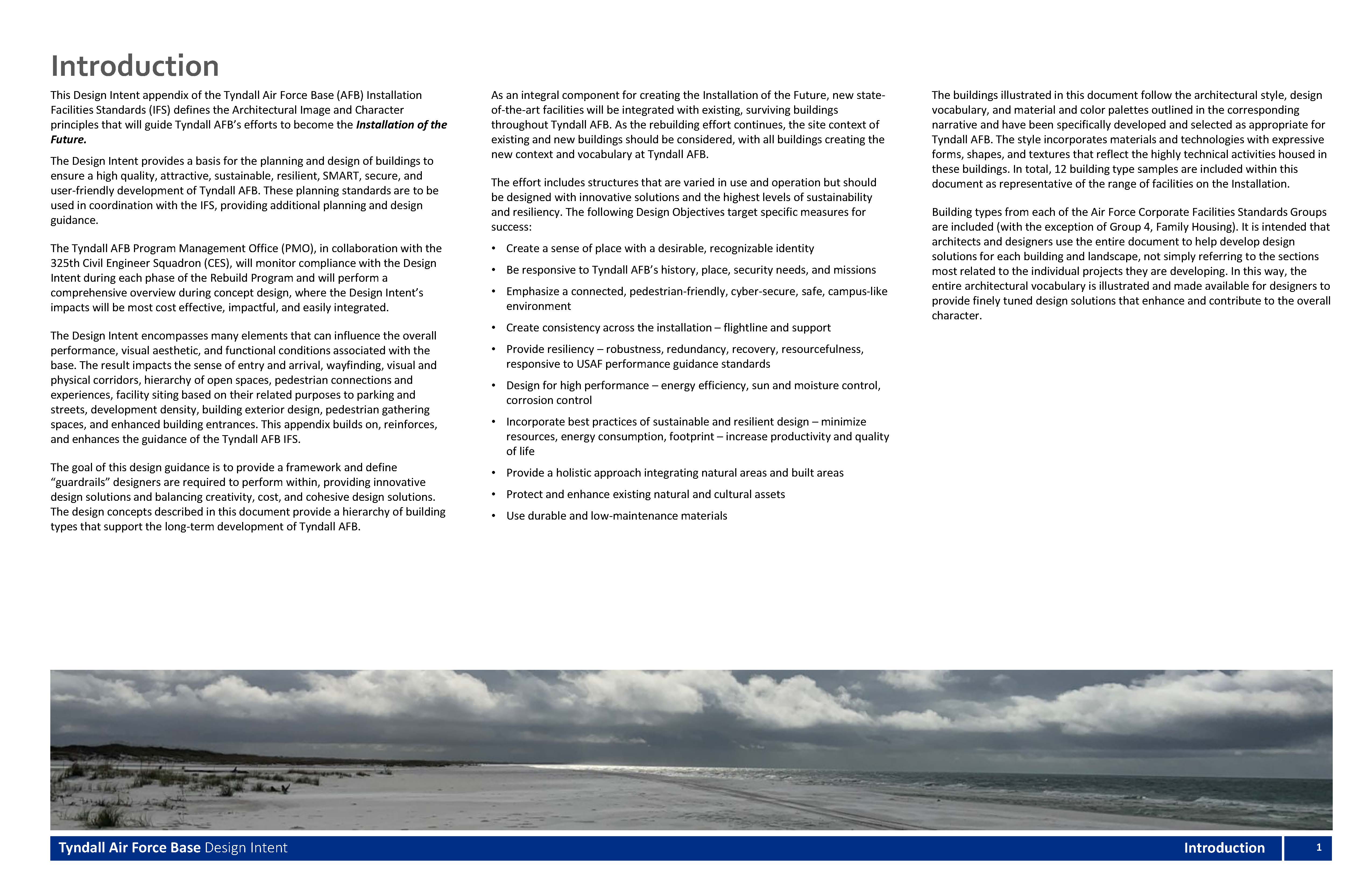 The Design Intent provides a basis for the planning and design of buildings to ensure a high quality, attractive, sustainable, resilient, SMART, secure, and user-friendly development of Tyndall AFB. These planning standards are to be used in coordination with the IFS, providing additional planning and design guidance.